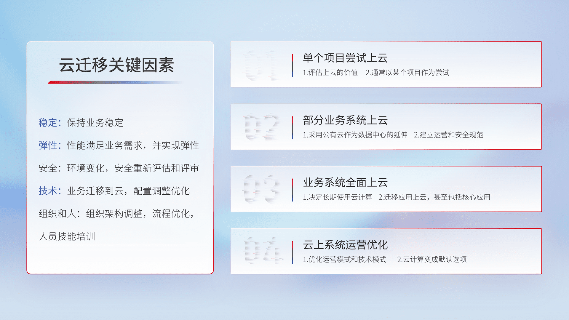 结合实际业务,,从规划设计、、、、云平台选型、、、云原生改造、、、、数据迁移、、、集成交付,,,迁移全过程为客户识别最佳上云路径,,做好风险识别管理,,,设计网络架构、、、身份权限、、、安全审计合规、、、操作审计、、、、日志审计、、、、监控告警策略、、、、多站点容灾设计等,,,对云上基础设施进行整体规划,,,,提升IT治理水平,,以满足弹性、、高可用、、高性能的需求。。